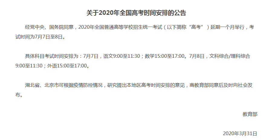 高考延期举行(湖北及北京除外),考试时间为7月7日至8日。