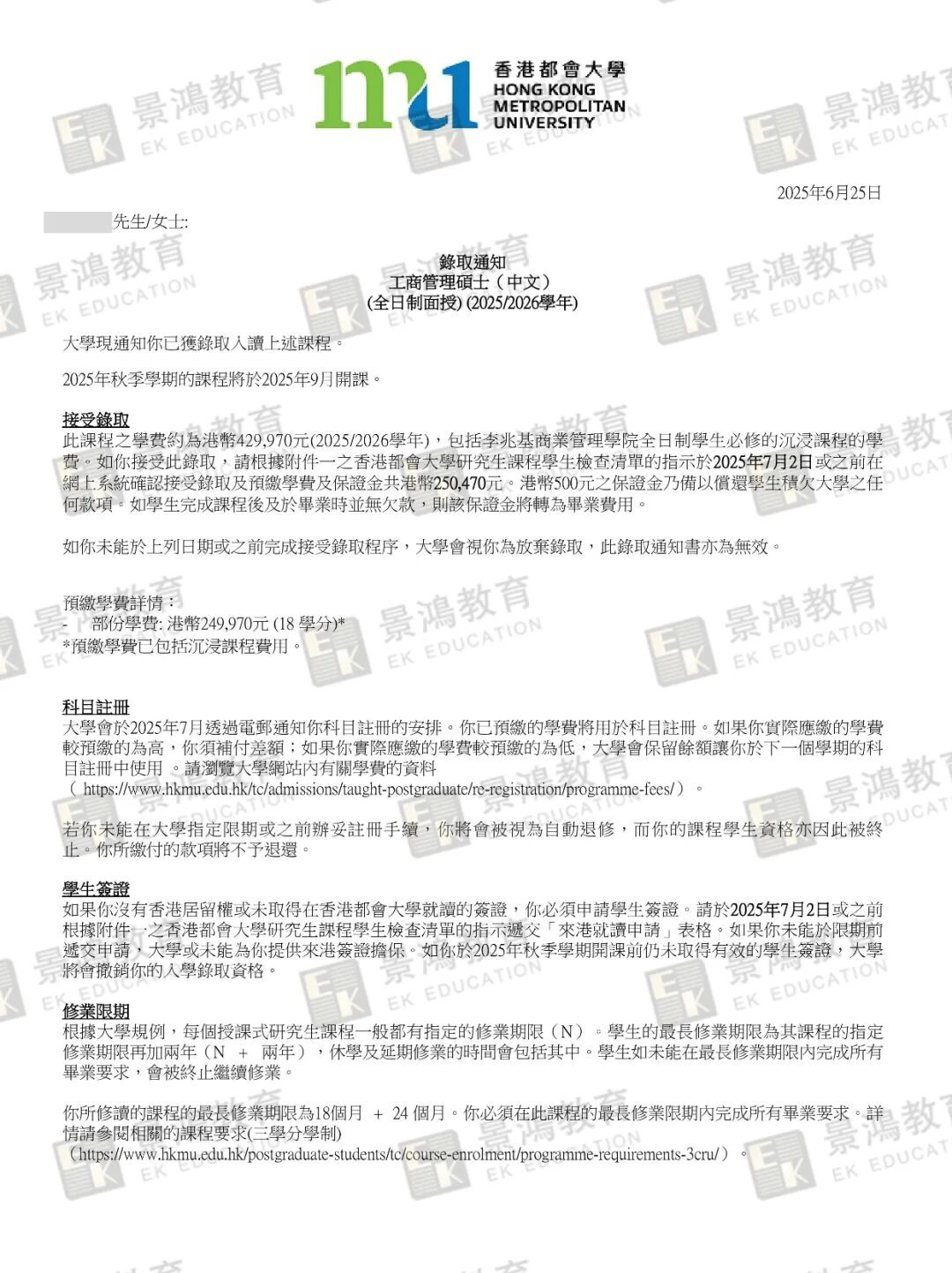 果然,在景鸿教育团队的充分准备下,L女士面试表现相当出色,成功获得了香港都会大学工商管理硕士(中文)的录取资格。