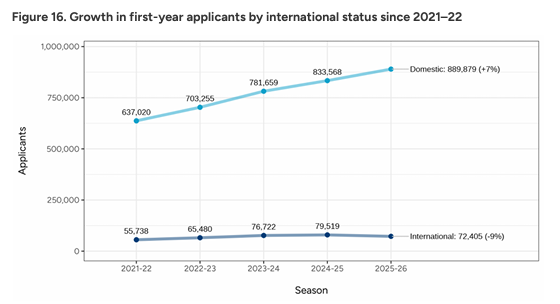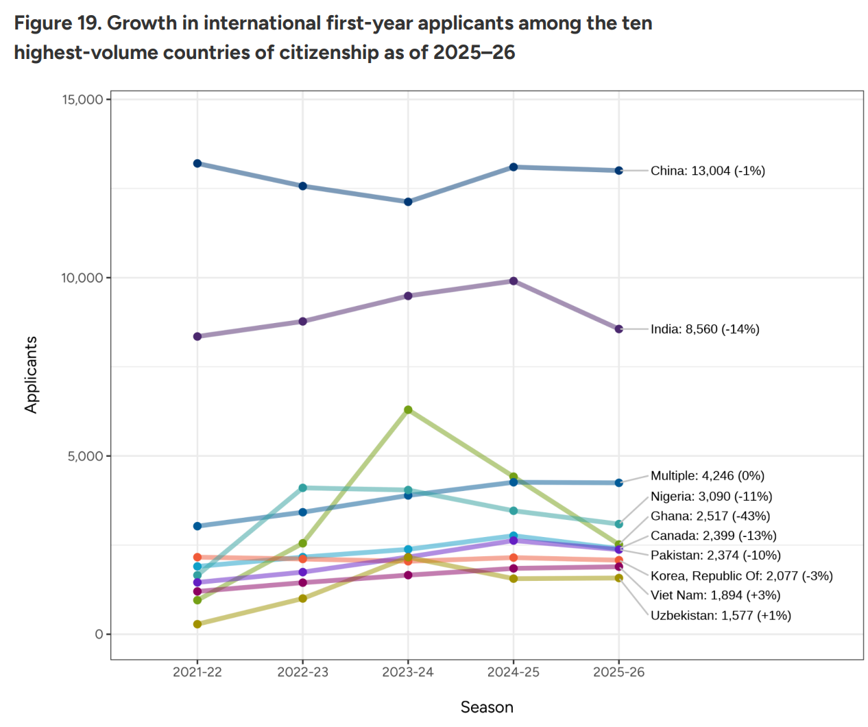 而今年中国留学生申请人数为13,004人,仅较上年减少1%,基本趋于稳定,依然是美国留学申请的主力军,凸显中国学生对美国教育的持续认可。相比之下,国际生第二大来源国印度却大幅下滑,申请人数减少了14%。