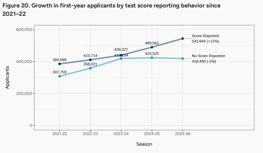 本申请季的数据也反映了这个趋势——提交标化成绩的申请人数显著增加,突破54万,比去年同期增加11%。而未提交标化成绩的申请人数减少1%至418,440人,这是近五个申请季来首次出现下降。
