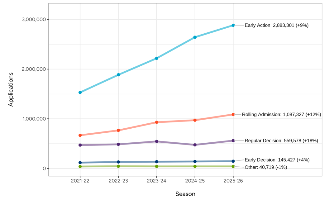 其中,与去年同期相比,申请人数增长5%,申请总数上升10%,显示美国本科申请的整体热度持续走高。更值得关注的是,申请人的“海投策略”愈发明显,人均申请院校数量升至4.9所,远超去年同期的4.68所。这意味着申请者的择校策略更趋多元,同时也加剧了院校间的生源竞争。