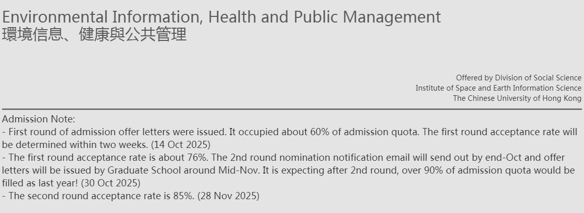 与此同时,香港中文大学的环境信息、健康与公共管理专业此前在官网上公布,经过第一、第二轮的申请,预计只剩下不到10%的学位供第三、四轮申请者竞争。