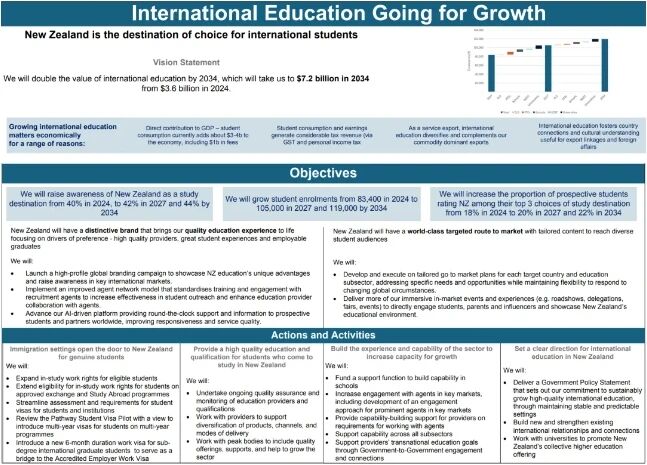 去年,新西兰政府重磅发布 《国际教育促进增长计划》 ,明确将举全国之力建设“教育强国”,并通过签证松绑、工签升级、经济目标翻倍等一系列措施,吸引全球学子前往留学。根据计划,新西兰期许未来十年,学生人数从2024年8.34万,增长至2034年11.9万。