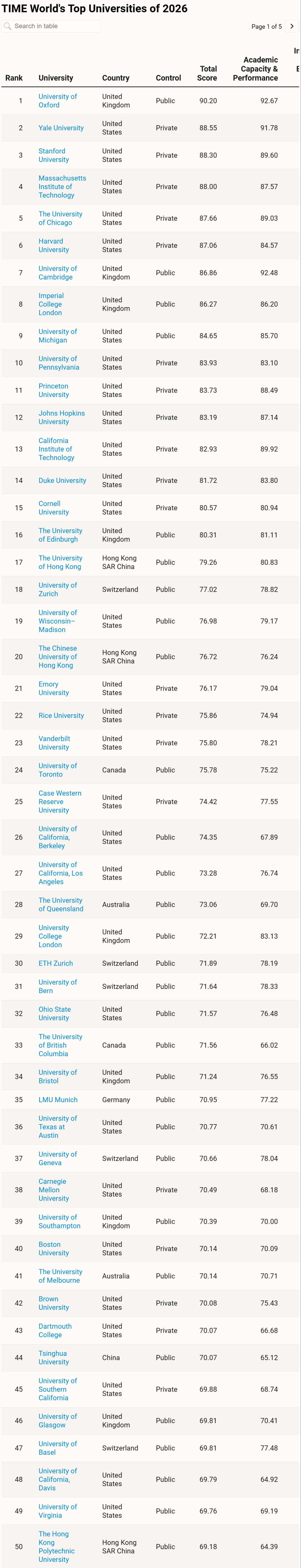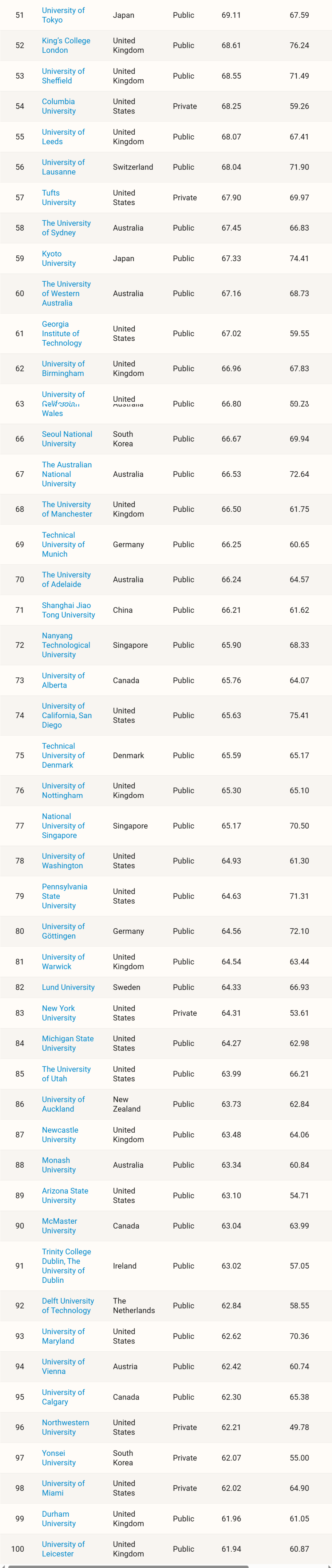 该排名既参考学校的学术实力,又重视学校知名度与影响力,排名因素参考三个维度:学术能力与表现 (60%)、创新与经济影响 (30%)、全球参与度 (10%)