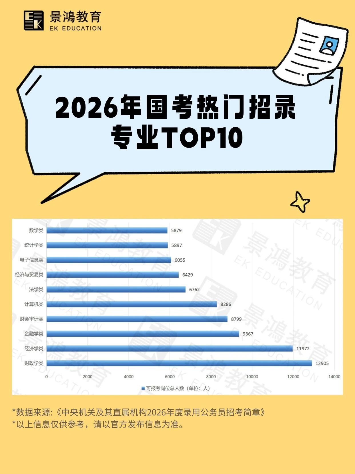 据中央机关及其直属机构2026年度考试录用公务员招考简章内容分析,几乎所有职位都有专业要求,其中,财政学类以12,905的可报考岗位总人数位居热门专业榜首,经济学类、金融学类紧随其后。