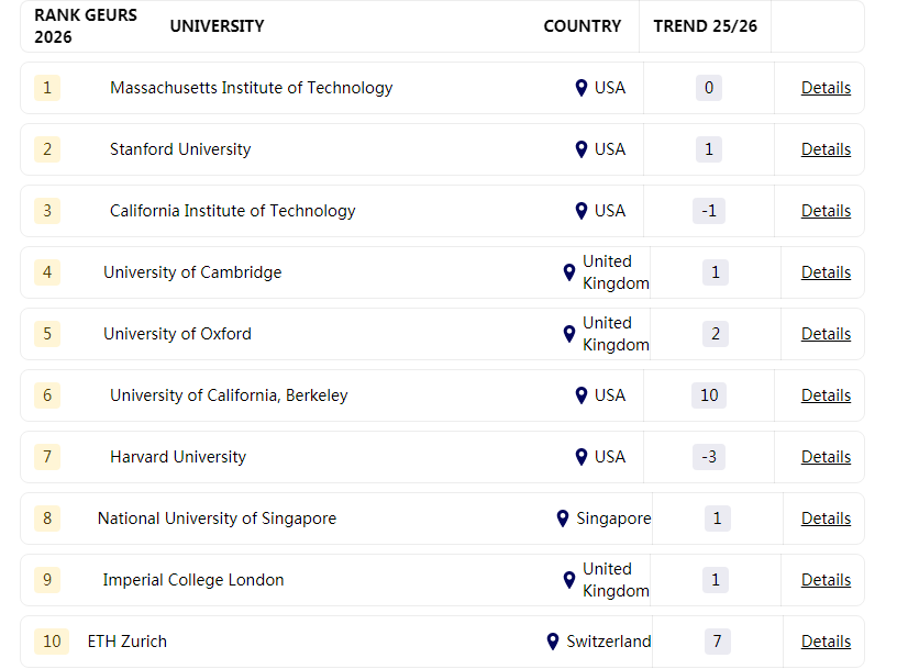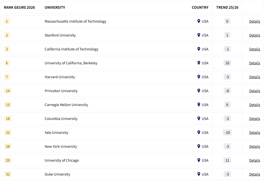 美国的高校占了5席,而且世界TOP 3都是美国高校,分别是MIT、斯坦福大学和加州理工学院。