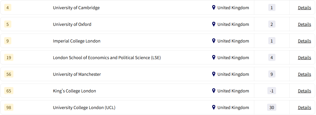 英国3所G5高校上榜,剑桥大学第4、牛津大学第5、帝国理工学院第9。