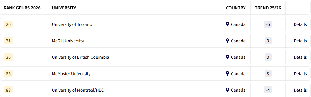麦吉尔大学、不列颠哥伦比亚大学分别排在第31名和36名,共同构成加拿大就业力的前三大学。