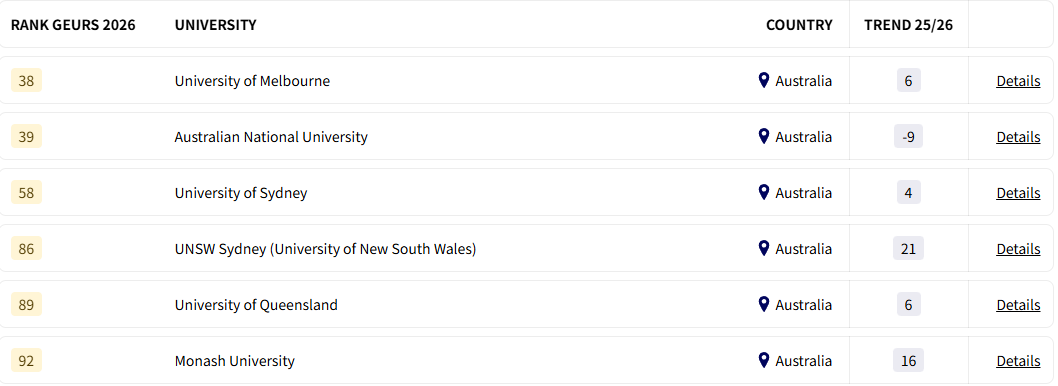 其中排名最优的是墨尔本大学,排在第38名,澳大利亚国立大学紧随其后,排在第39名。