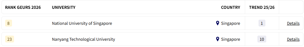 今年新加坡依旧是新加坡国立大学和南洋理工大学2所院校上榜,排名均有上涨!