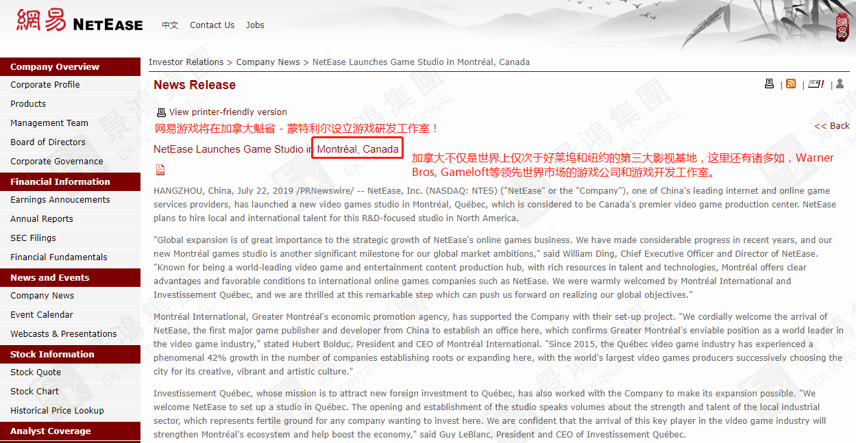 而近日,加拿大魁省游戏市场再添一员:网易游戏正式官宣,将在魁省 - 蒙特利尔设立游戏研发工作室!真是普天同庆的好消息!