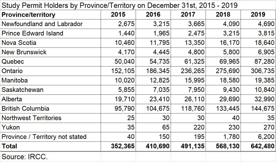 2019年,安大略省接待了大约48%的加拿大国际学生,即近307,000人。BC省紧随其后,占加拿大国际学生的23%,约145,000人。