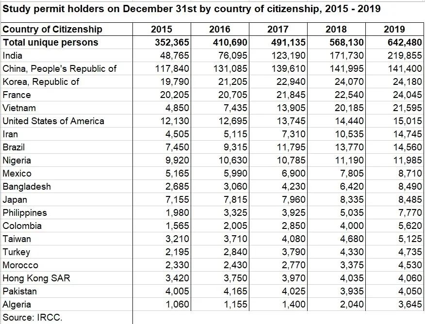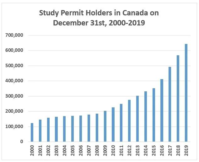 根据加拿大官网数据显示,2019年加拿大的国际学生人数与上一年同比增长13%,有404,000名国际学生在去年拿到了学习许可证,这使得加拿大目前拥有多达642,000名国际学生,已然成为全球第三大留学国家。
