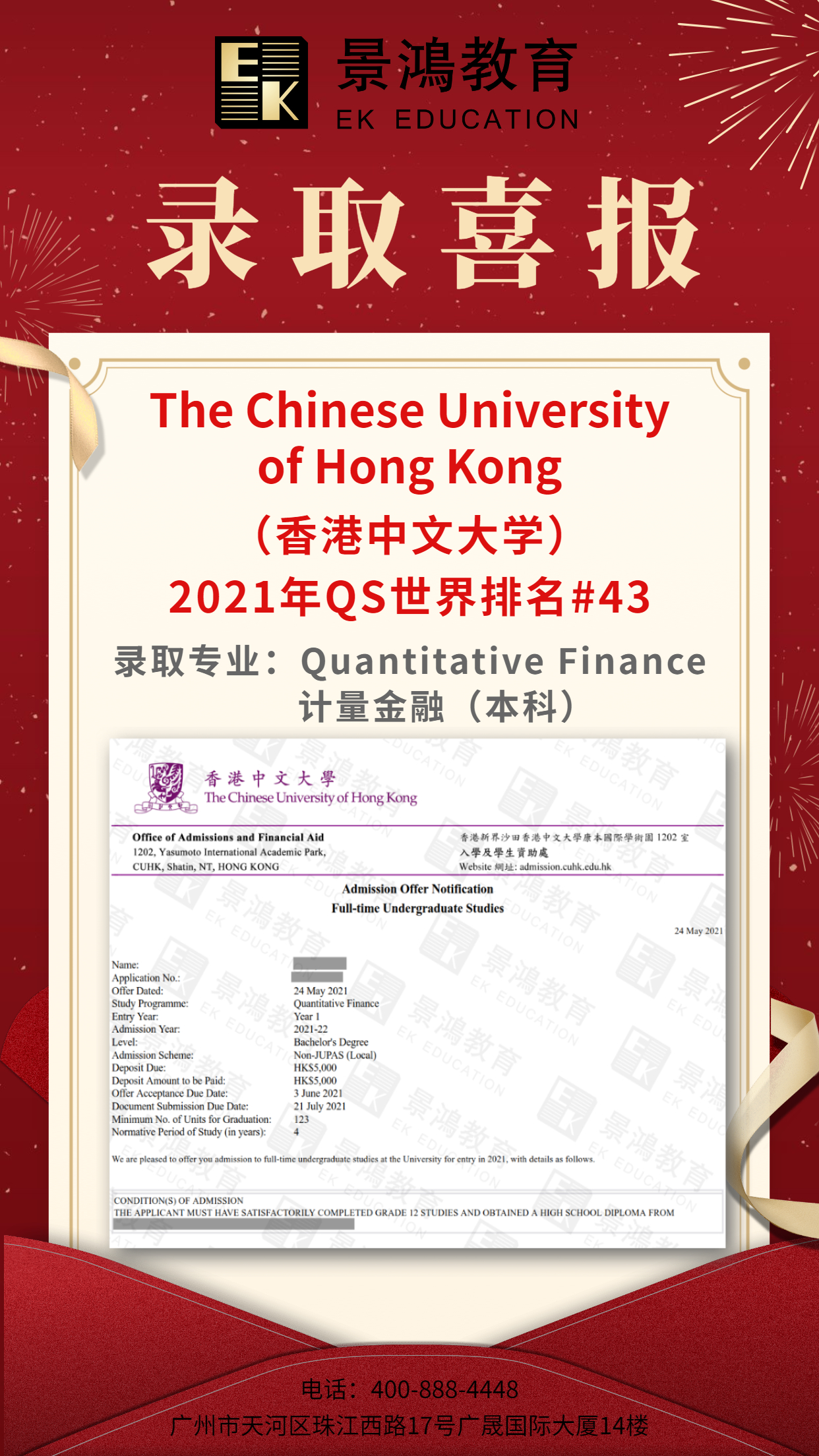 恭喜景鸿小伙伴获得香港中文大学录取!