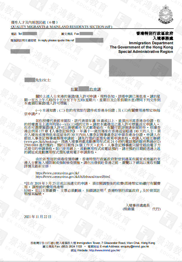 恭喜景鸿客户W先生顺利获批香港IANG签证