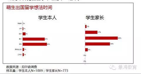 在计划通过中介出国的留学人群中,家长多在孩子义务教育阶段即萌生了送孩子出国留学的想法,在初中就萌生让孩子出国留学想法的学生家长占比44%,在高中时的占比34%。而孩子自我意识的觉醒相对较晚,往往会在高中及以后才会萌生出国留学的念头,最多的发生在本科,占比46%,高中时想去留学的占比为42%。