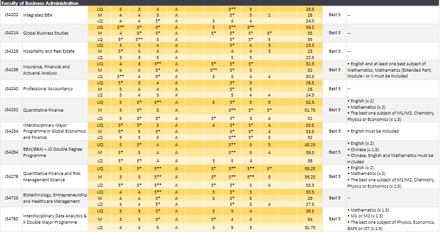 学生必须在DSE四个核心科目(中文、英文、数学及公民与社会发展科)上分别获得332A的成绩(即“332”及公民与社会发展科“达标”),并在两个选修科目上获得3级(或一科选修科目及数学延伸单元一或二达到3级/其他语言科目达到E级)的成绩。