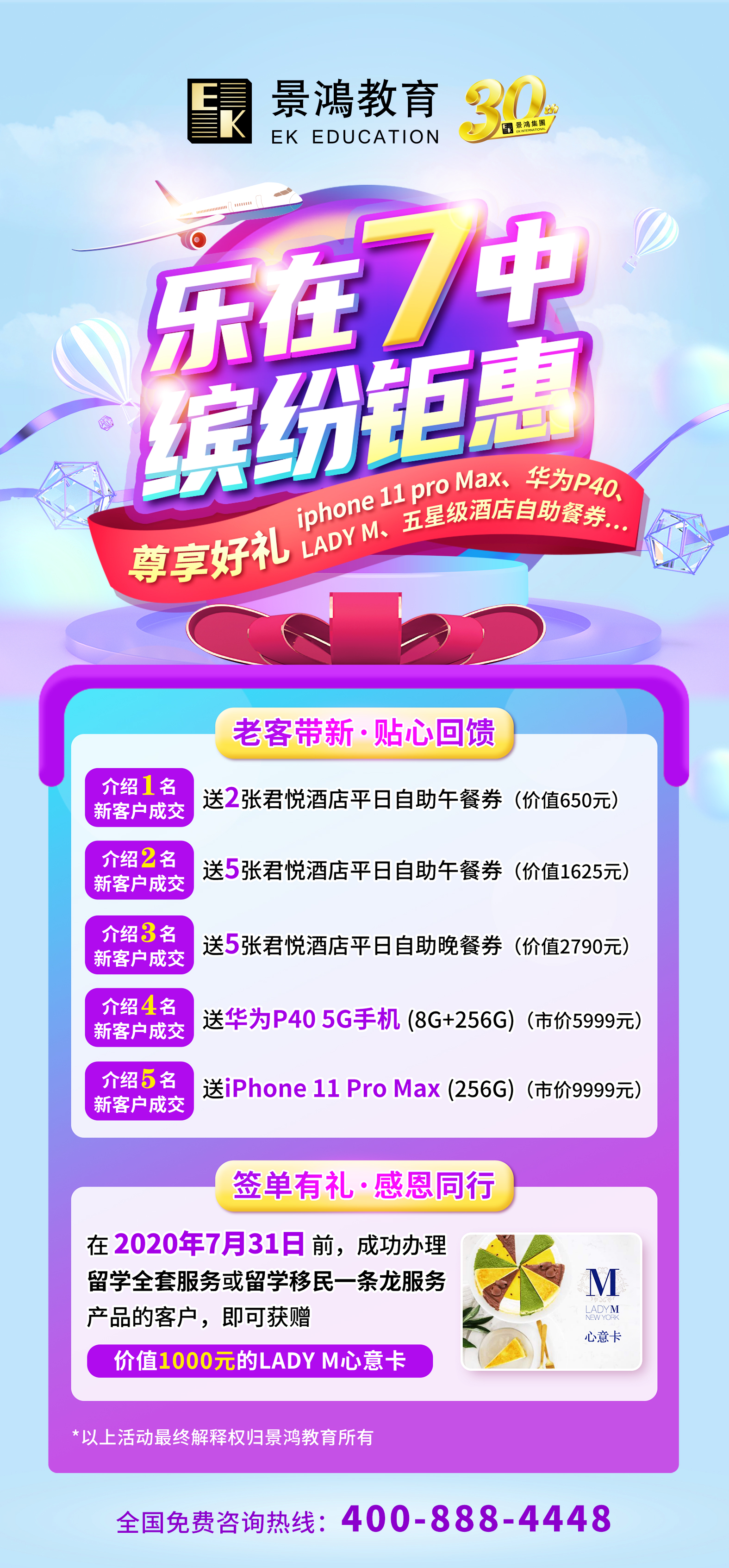 2020年,特殊的一年, 感恩有您的陪伴! 景鸿教育7月缤纷钜惠, 为您送上尊享好礼, iPhone 11 pro、华为P40、 LADY M、五星级酒店自助餐券……