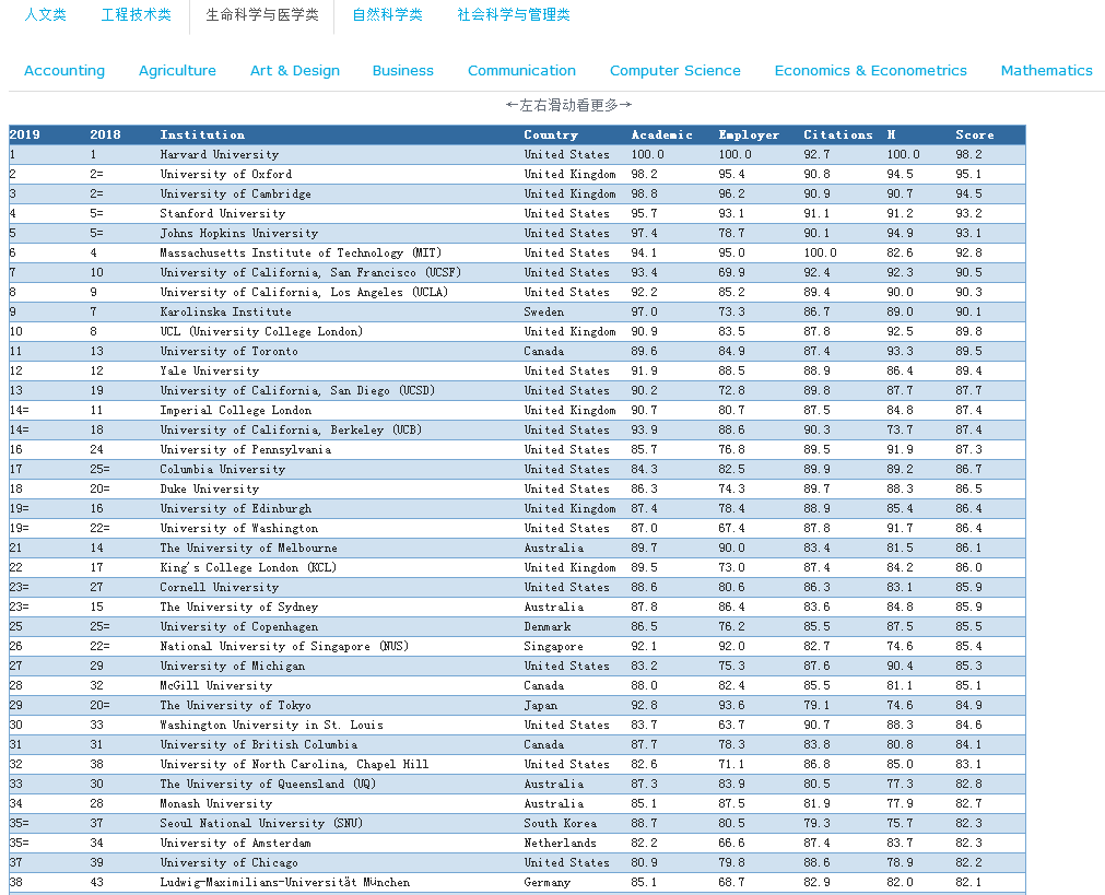 以及9个细分专业排名:农业与林业、解剖与生理学、生物科学、牙科、医学、护理、药学与药理学、心理学、兽医学。