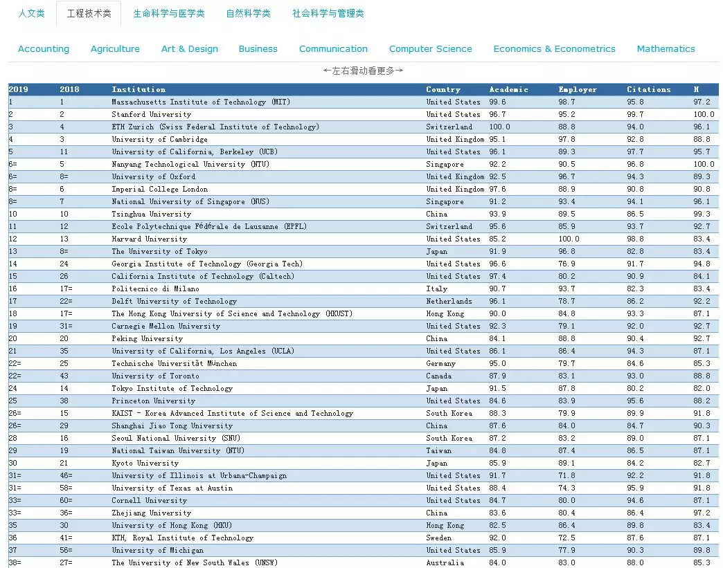 工程技术学科排名前三分别是麻省理工大学、斯坦福大学、苏黎世联邦理工大学,以及6个相关专业排名,包括计算机科学&信息系统、化学工程、土木工程、电子电气工程、航空与制造工程、采矿工程。