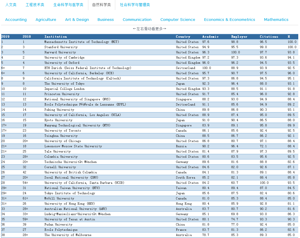 自然科学Top 3的排名分别是麻省理工大学、斯坦福大学、哈佛大学。以及7个细分专业:化学、地球与海洋科学、环境科学、地理学、材料科学、数学、物理与天文学。
