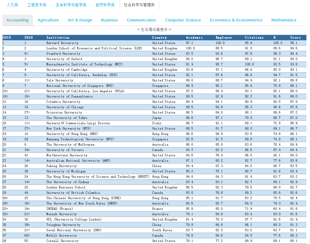 社会科学和管理排名中,前三分别哈佛大学、伦敦政治经济学院、斯坦福大学。