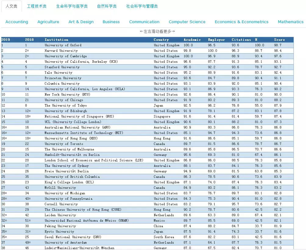 人文艺术学科排名及11个细分专业排名,共12个排名榜单,人文艺术学科排名Top 3 分别是牛津大学、哈佛大学、剑桥大学。