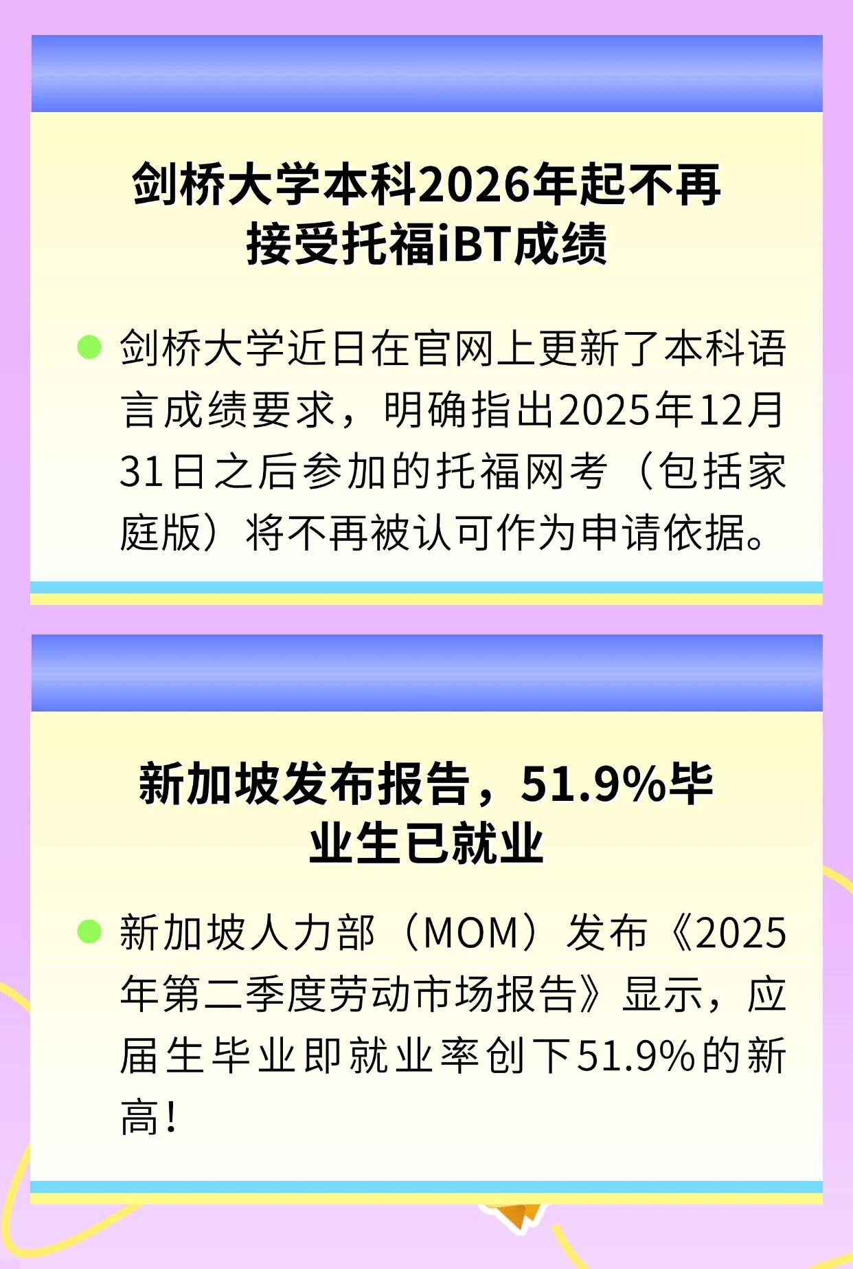 本周有哪些值得您关注的教育资讯呢? 1. 剑桥大学本科2026年起不再接受托福iBT成绩; 2. 由2026/27学年起,香港非本地生学额将再增加至50%; 3. 新加坡应届生毕业即就业率创下51.9%的新高。 素材来源于官方媒体/网络新闻