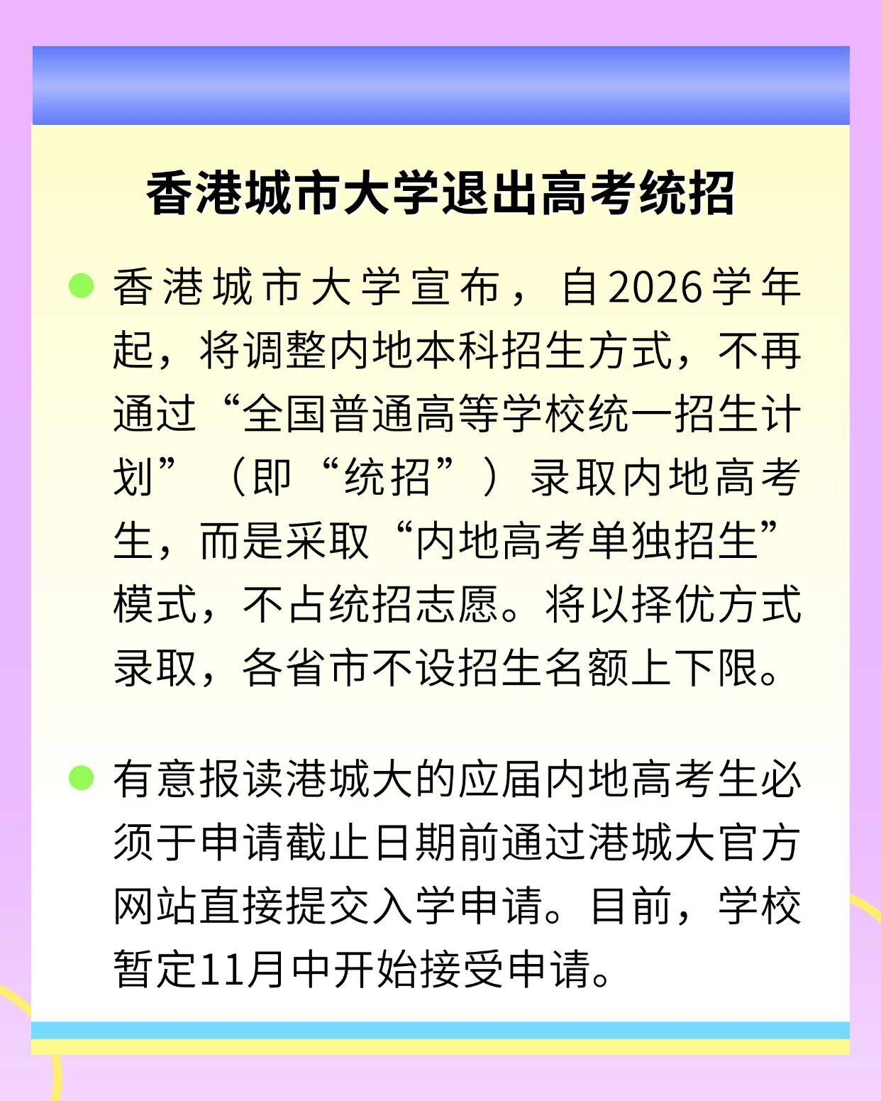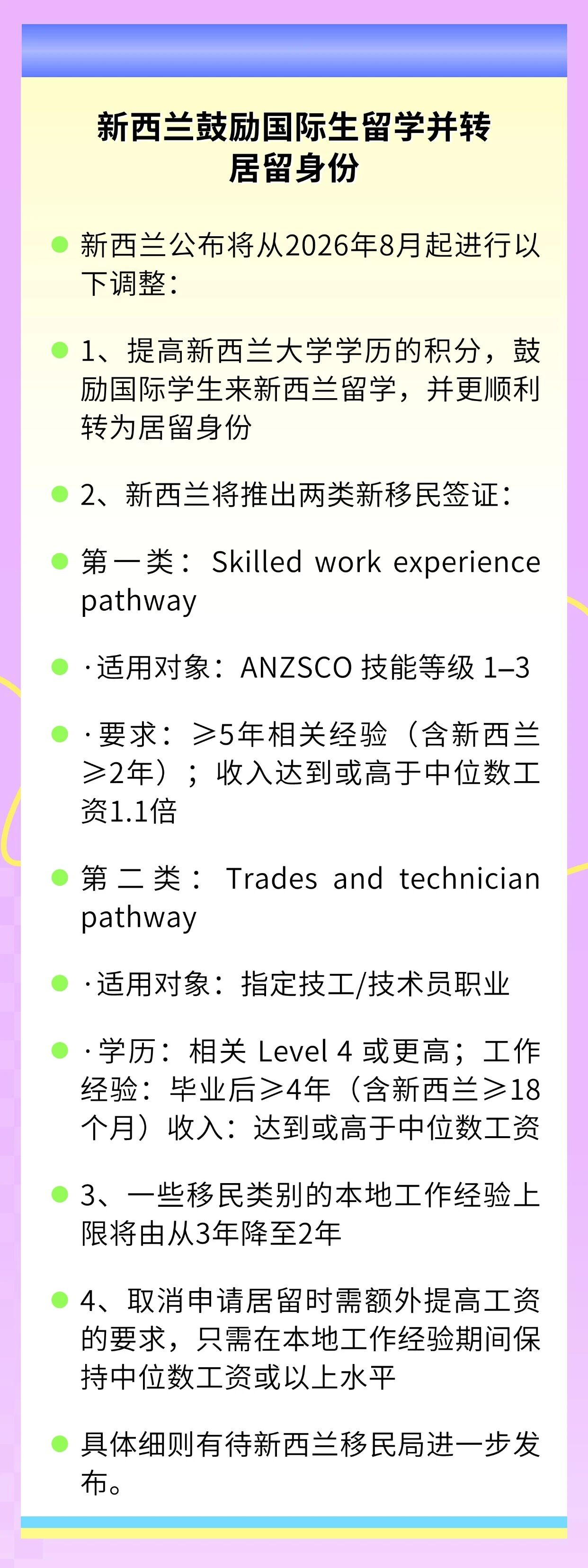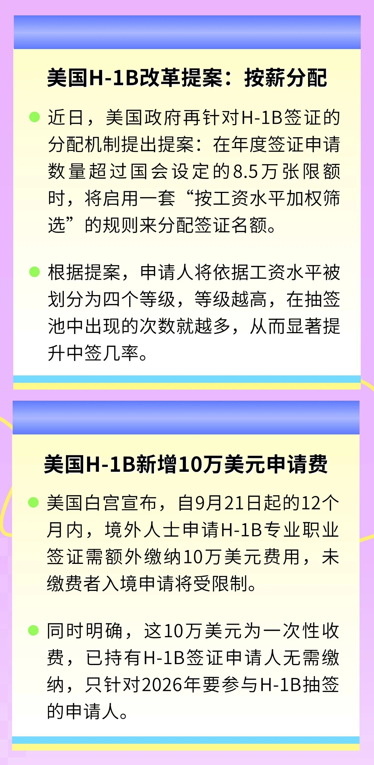 本周有哪些值得您关注的教育资讯呢? 1. 提高新西兰大学学历的积分,鼓励国际学生来新西兰留学,并更顺利转为居留身份; 2. 美国针对H-1B改革提案,将启用一套“按工资水平加权筛选”的规则来分配签证名额; 3. 美国要求境外人士申请H-1B专业职业签证需额外缴纳10万美元费用; 4. 香港城市大学26学年起将不再参与高考统招,改为自主招生。 素材来源于官方媒体/网络新闻