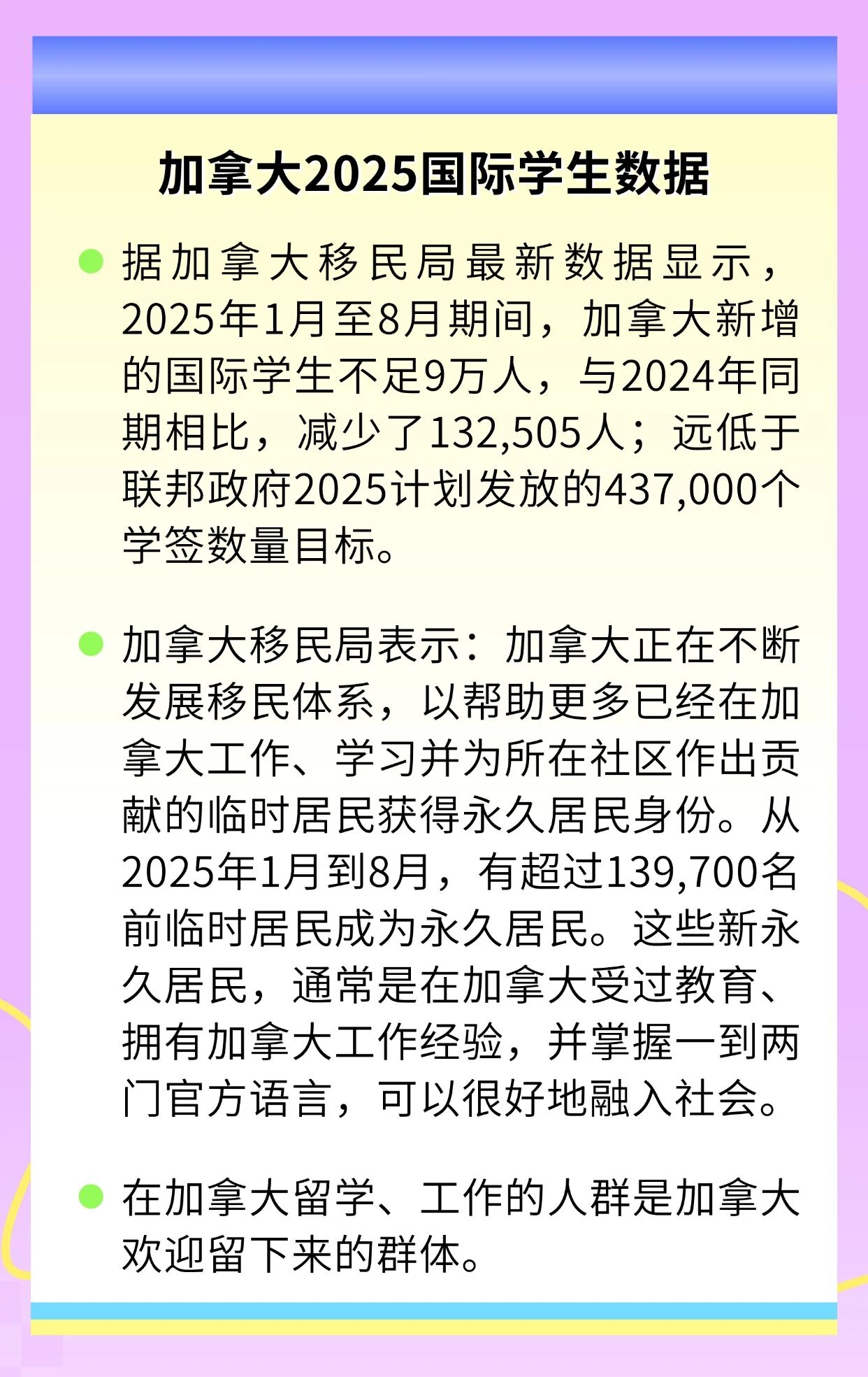 1. 2025年1月至8月期间,加拿大新增的国际学生不足9万人,与2024年同期相比,减少了132,505人;