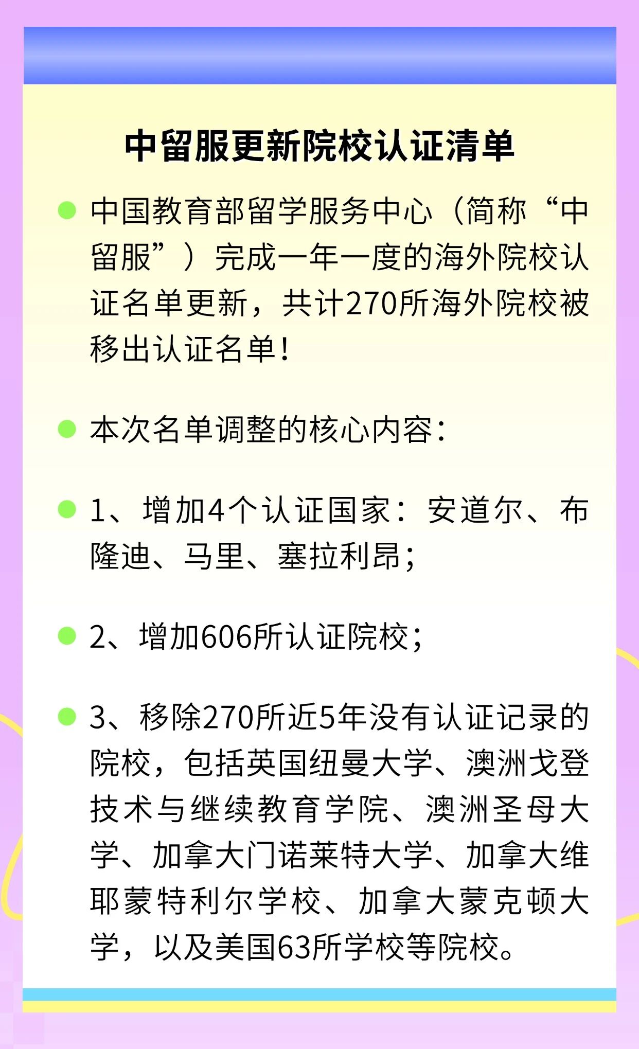 2. 中留服更新院校认证清单,增加4个认证国家、新增660所认证院校,同时删除270所包括英、美、澳、加等国在内的院校;