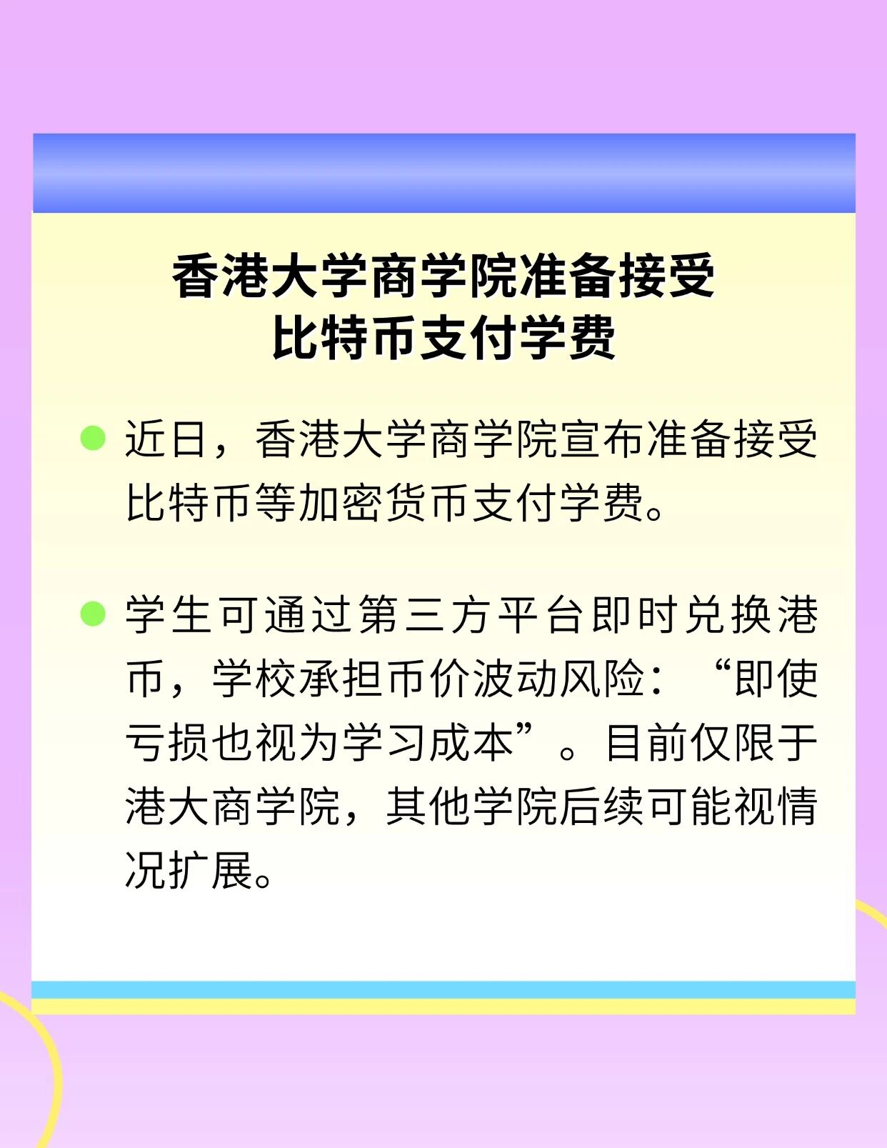 3. 香港大学商学院宣布准备接受比特币等加密货币支付学费。