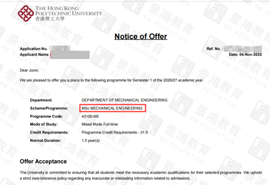 从10月10日递交申请到11月4日获得录取,景鸿教育最终成功协助O同学拿下香港理工大学的录取!