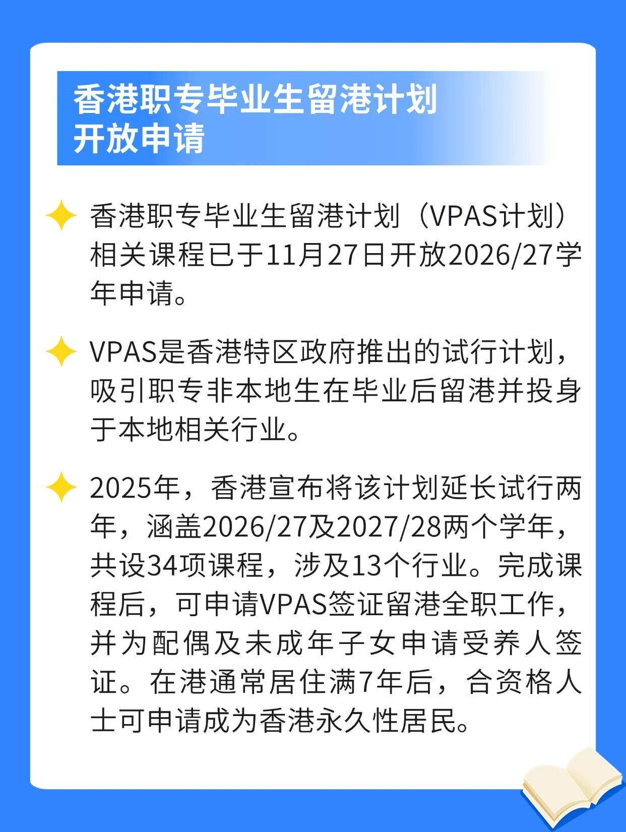 本周有哪些值得您关注的教育资讯呢? 1?? 香港职专毕业生留港计划(VPAS计划)2026/27学年相关课程已开放申请;