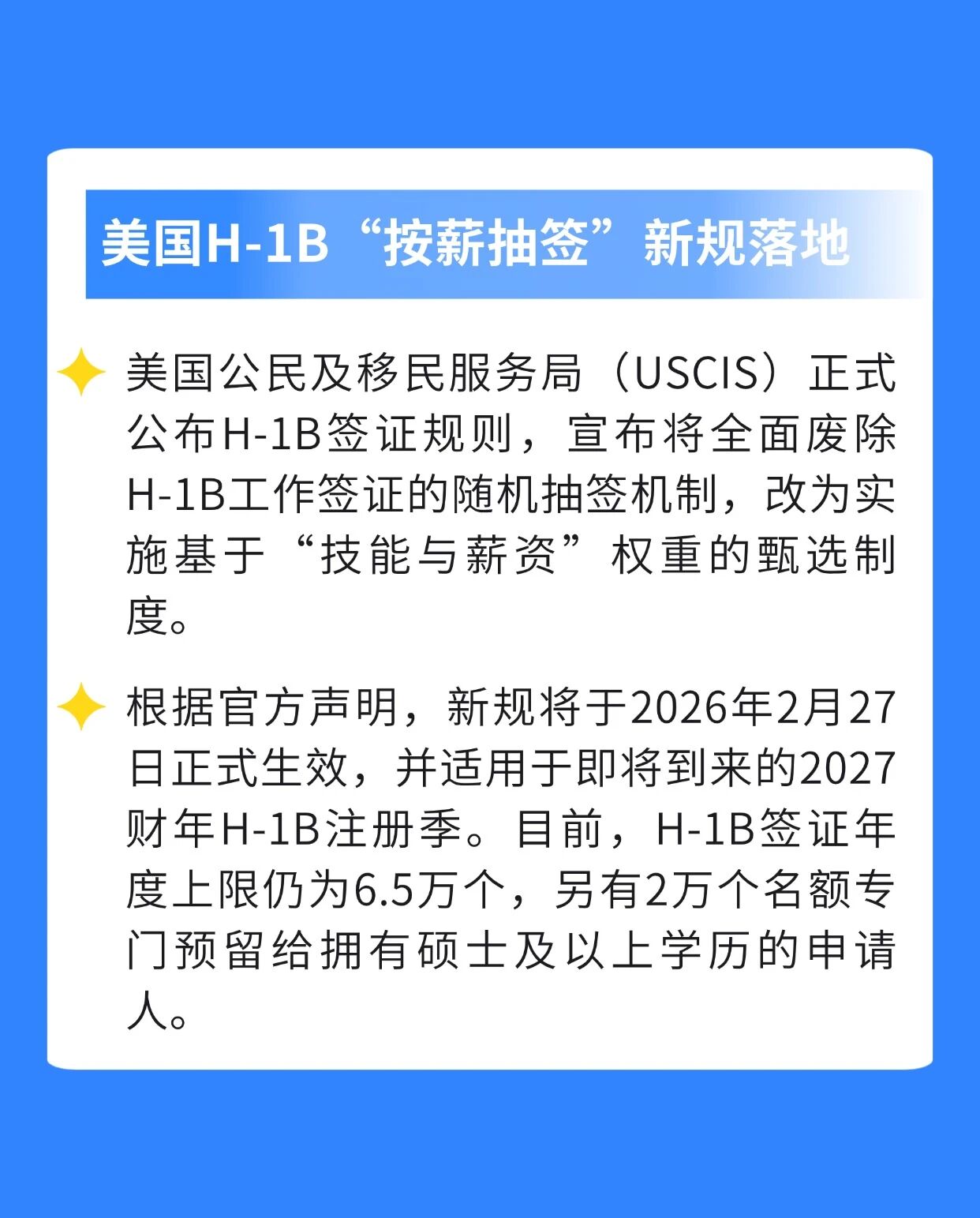 本周有哪些值得您关注的教育资讯呢? 1、香港教资会公布毕业生年薪数据,本科毕业生、授课型硕士均有增长; 2、香港5所官津小学下学年升中校网改至湾仔区; 3、美国H-1B签证即将全面废除随机抽签,改为按“技能与薪资”权重的甄选制度,新规将于2026年2月27日正式生效; 4、加拿大缩短预科课程学签有效期,更新毕业工签PGWP资格指引。 *以上资讯整合自网络。请以官方公布为准。