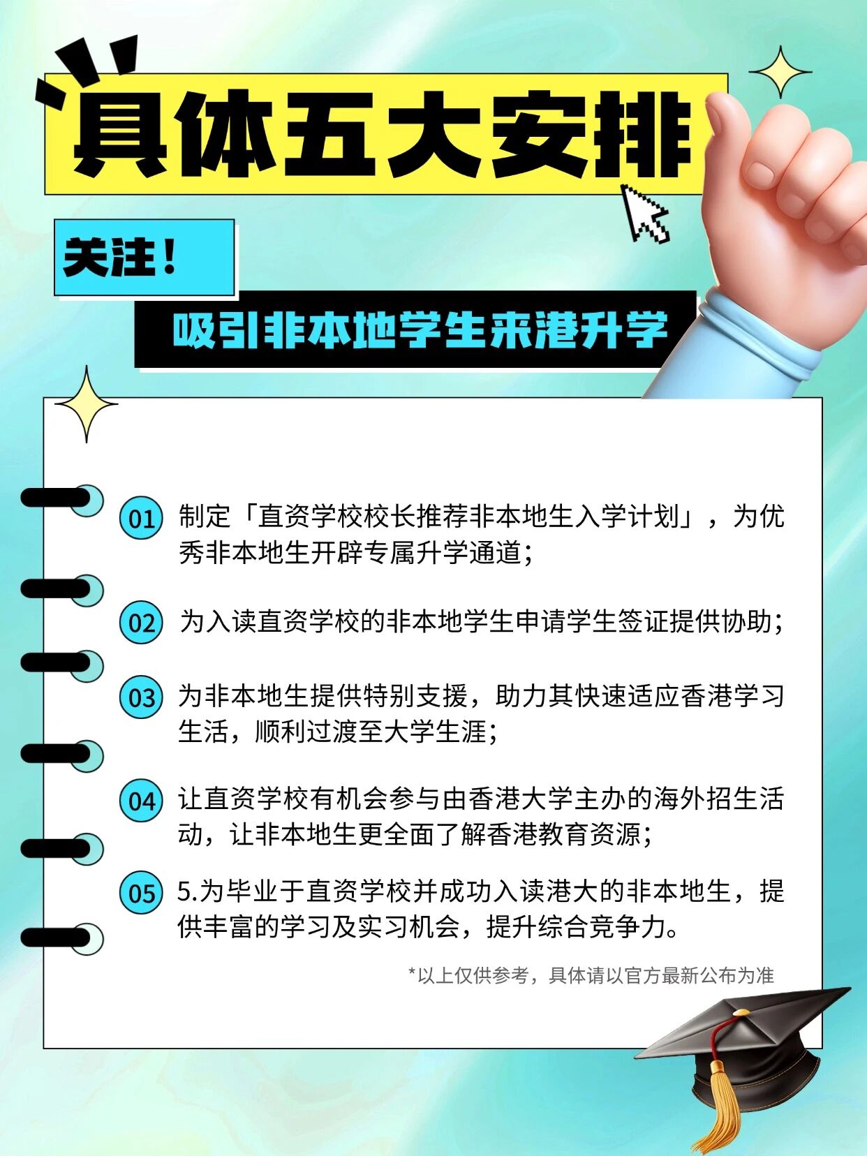 • 制定「直资学校校长推荐非本地生入学计划」,为优秀非本地生开辟专属升学通道;