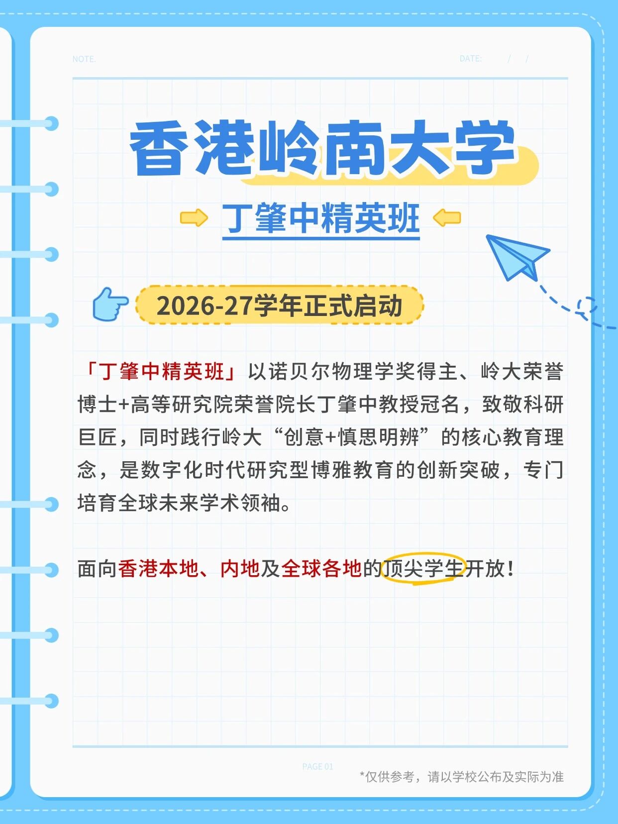 2026年3月3日岭南大学宣布,将于2026-27学年正式启动“丁肇中精英班”(Samuel C.C. Ting Elite Class)! 首届学生将从2026/27学年获颁全额入学奖学金的本科生中甄选而出,对象涵盖香港、内地及全球各地的优秀学生获选学生可获为期四年全额学费奖学金及四年住宿资助,并保证校园宿位安排
