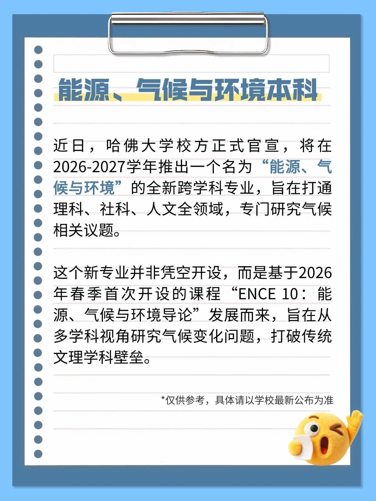 这个新专业并非凭空开设,而是基于2026年春季首次开设的课程“ENCE 10:能源、气候与环境导论”发展而来,旨在从多学科视角研究气候变化问题,打破传统文理学科壁垒。