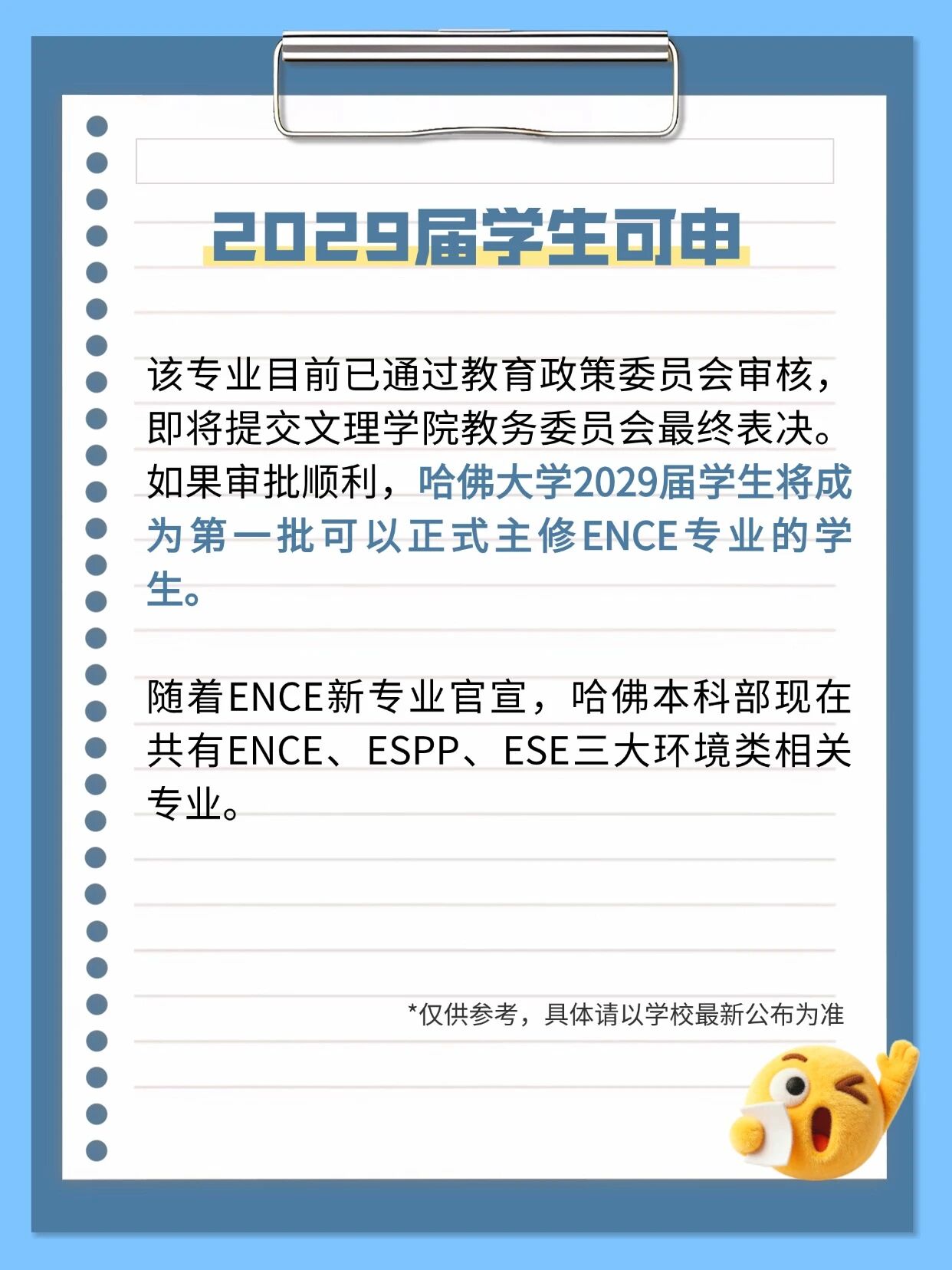 该专业目前已通过教育政策委员会审核,即将提交文理学院教务委员会最终表决。如果审批顺利,哈佛大学2029届学生将成为第一批可以正式主修ENCE专业的学生。