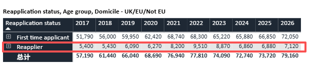 从上图可见,截至10月15日,英国本土申请人数为54820人,相比去年增加了2920人。其中18岁英国青年有41010人,这一数字甚至超过了英国18岁人口4.5%的增长率,达英国历史新高。