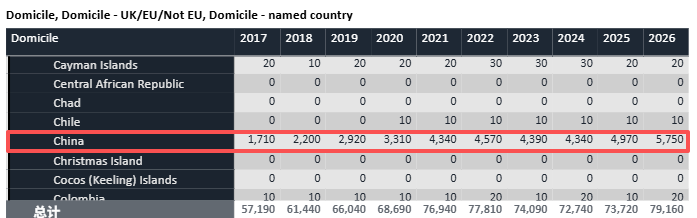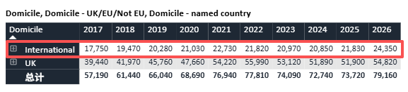 数据显示,国际学生申请人数为24350人,除了中国以5750人、申请人数增长了780人,是最大的国际学生申请国家以外,来自美国(+280人)、新加坡(+230人)和印度(+140人)的申请者需求也在持续增长。