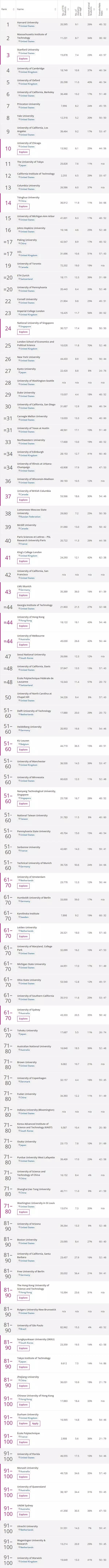 排名前10名大学中8所来自美国,哈佛大学领跑、麻省理工学院和斯坦福大学分别为第二和第三名。前100名中,42所大学来自于美国,10所大学来自于英国,中国有10所大学进榜,澳大利亚有6所大学进榜。