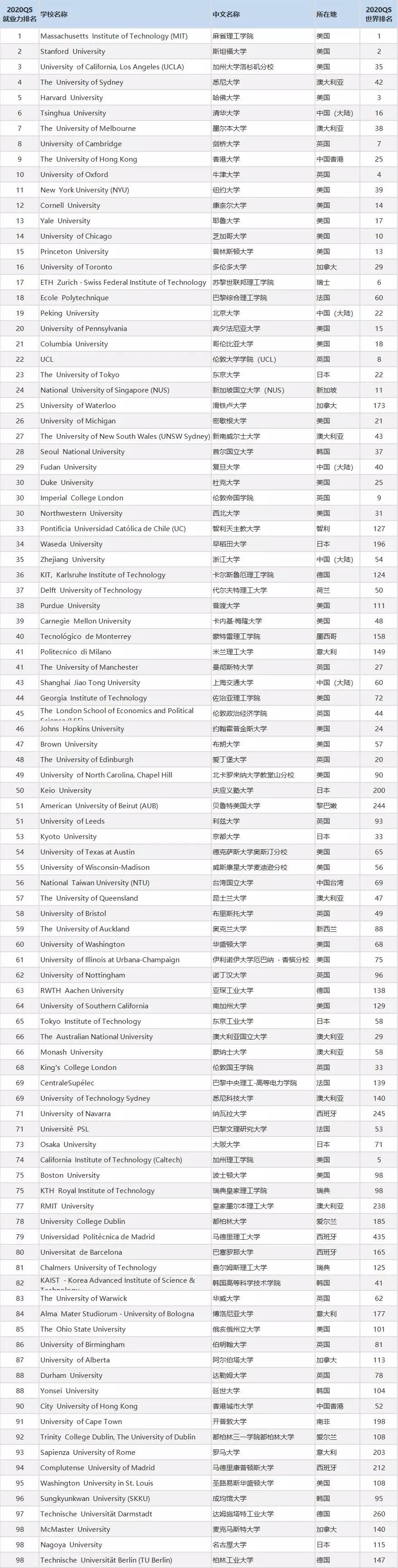下面,来看看2020QS世界大学就业力排名TOP100榜单吧!