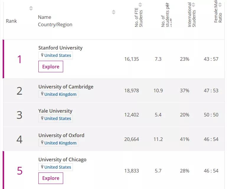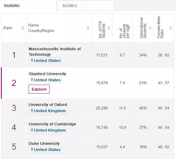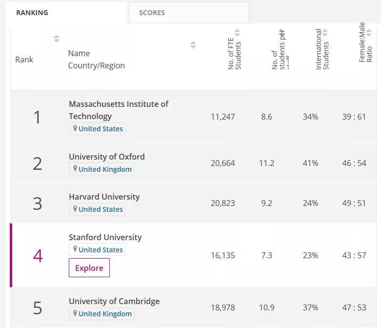 前4名没有变化,依然是MIT、斯坦福大学、牛津和剑桥;