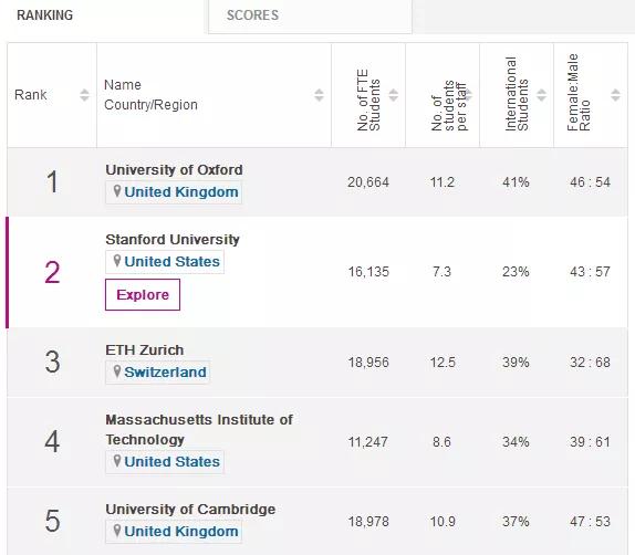 TOP3变化不大,牛津蝉联第一,斯坦福大学第二,ETH第三;