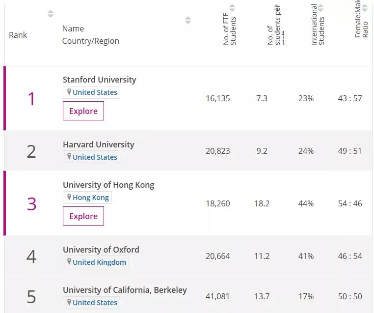 前三名发生了变化,斯坦福第一,哈佛第二没有变,但是港大挺进top 3,伯克利跌至第5;