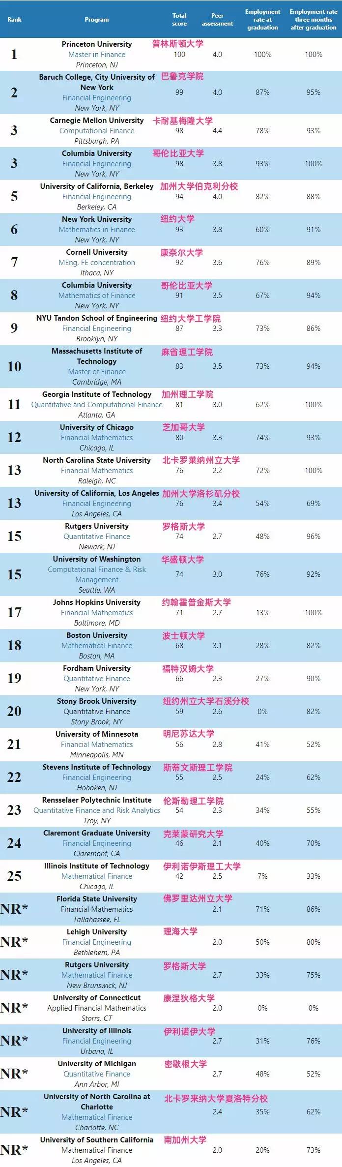 QuantNet是金融工程专业权威排名网站,在2020年最新北美金融工程硕士项目排名中,对38个Financial Engineering、Mathematical Finance、Quantitative Finance硕士项目的招生、就业和职业服务信息进行调查,其中有25个提供了相关数据。