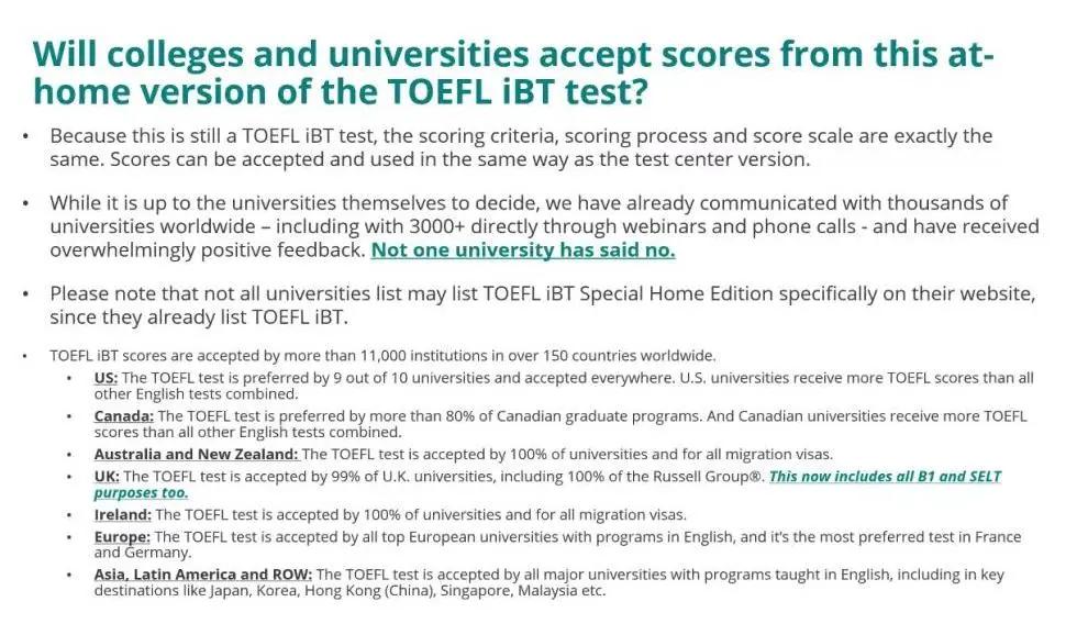 关于在家考成绩是否被接受,官方目前已与上千家学校进行了沟通,得到的回复是:“Not one university has said no.”没有任何一个学校回复不接受考试成绩。换句话说,所有大学应该都接受家庭版托福成绩。