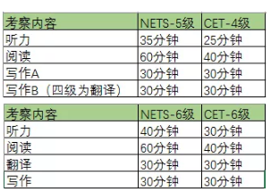 从图中可以看到,以网传代替四六级的NETS-5级和6级来看,听力部分,NETS比CET多了10分钟,阅读部分多了20分钟,写作可能出现新的模式,不难预测,NETS考试的难度更大。