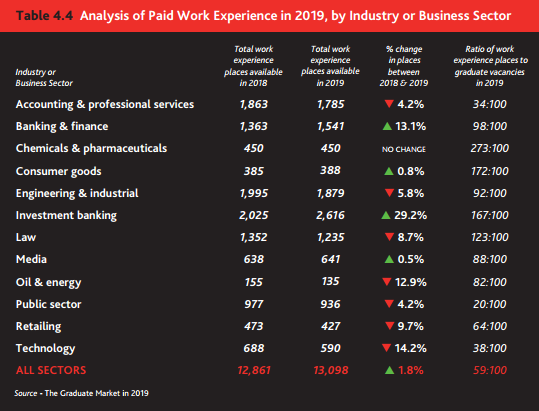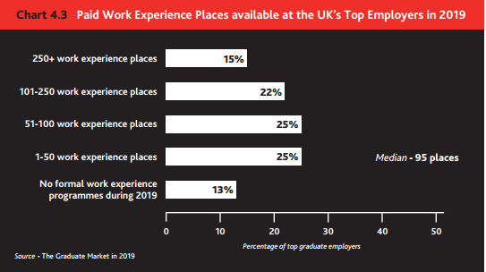 英国毕业生可获得的工作经验名额预计2019年将增加1.8%,有超过80%的顶级毕业生雇主为2018-2019学年期间的在校生及应届毕业生提供有偿实践及实习机会,共提供13,098个名额。